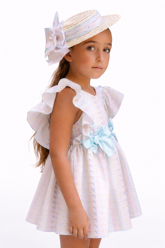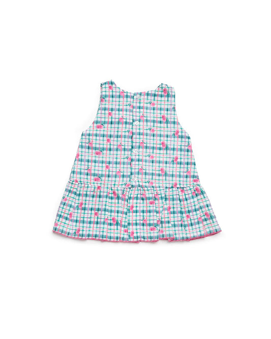 Vestido cuadros verdes/cerezas con 2 moños rosas