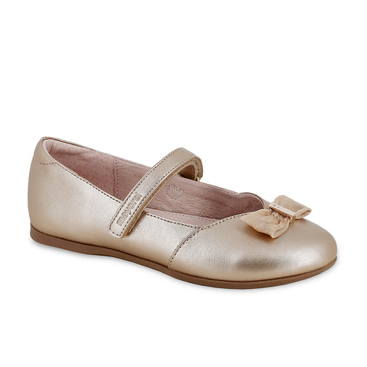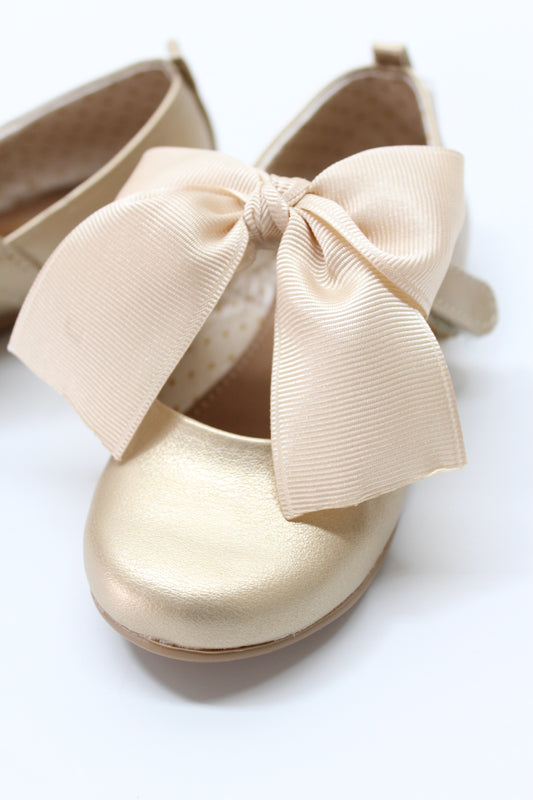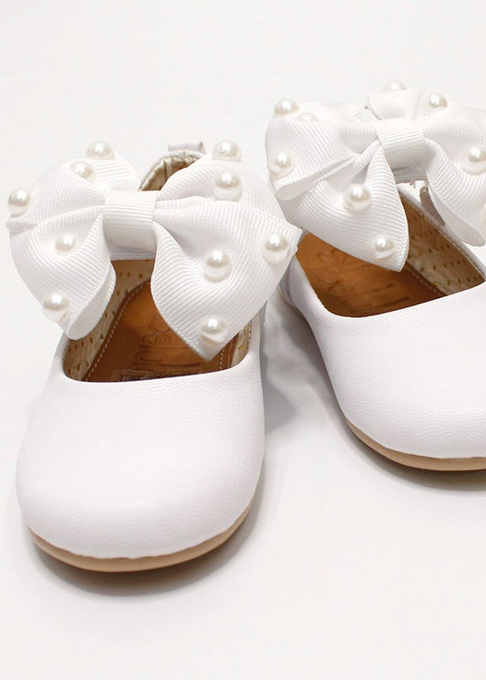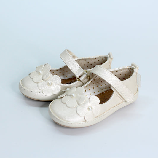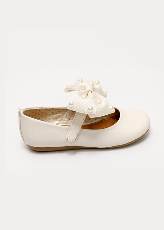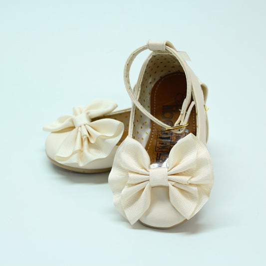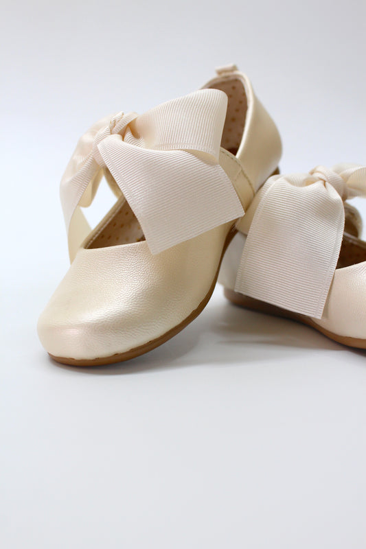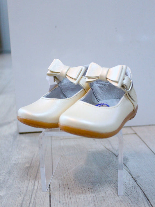 Zapato crema nacarado con moño doble y cierre con hebilla