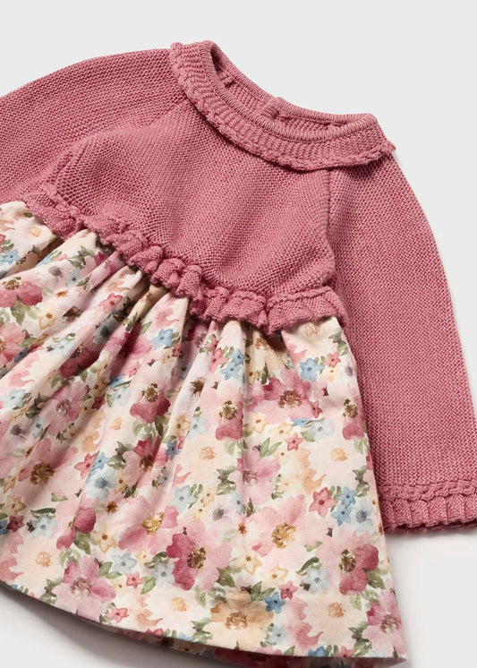 vestido tricot, peto rosa, con falda flores de colores