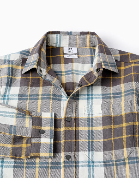camisa manga larga, crudo, a cuadros amarillo y plomo
