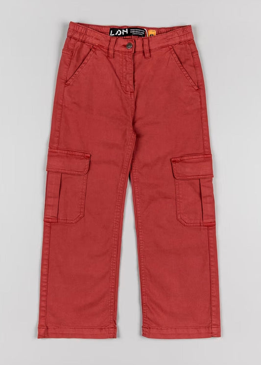 blusa manga larga color blanco y pantalón cargo rojo obscuro, marca losan