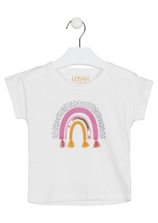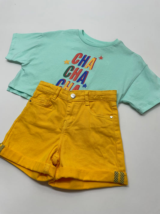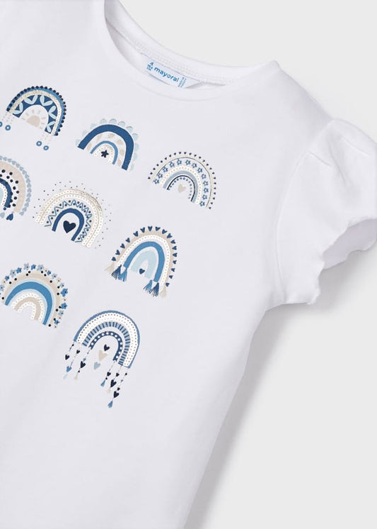 Set blusa mangas murcielago estampado azul y short denim blanco