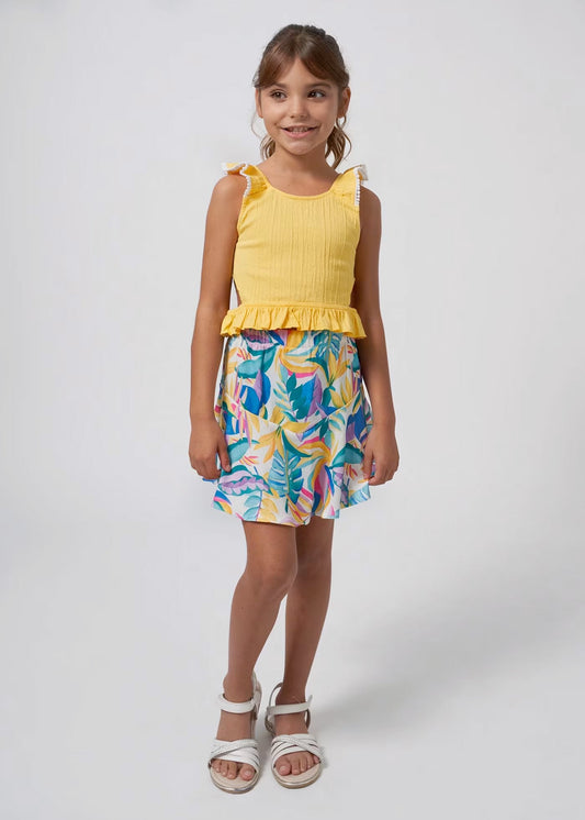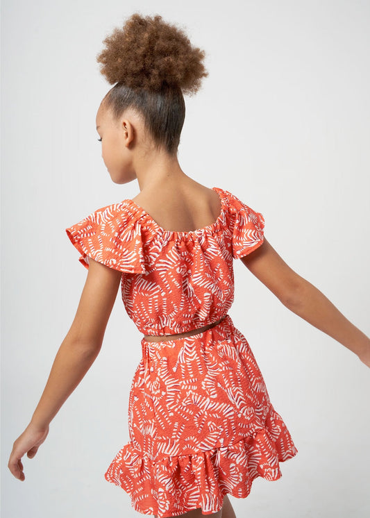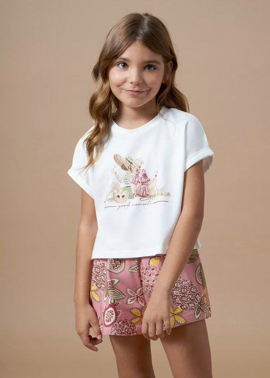 set 2 piezas short denim naranja, camiseta blanca print niña