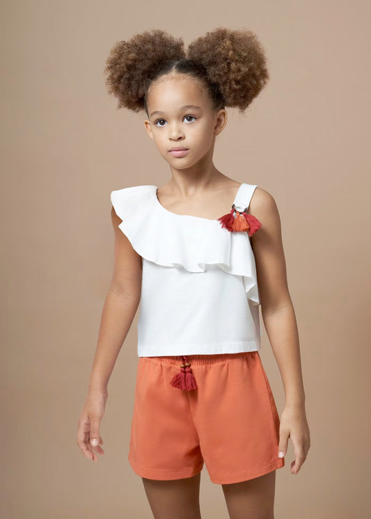 conjunto 2 piezas, blusa manga asimetrica, short naranja