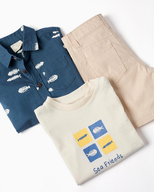 Conjunto Camisa + Camiseta + Bermuda para Bebé Niño 'Sardinhas', Azul/Beige