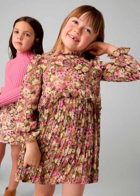 vestido color camelia, manga larga, detalle en cintura. mayoral