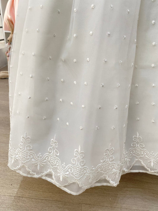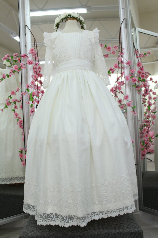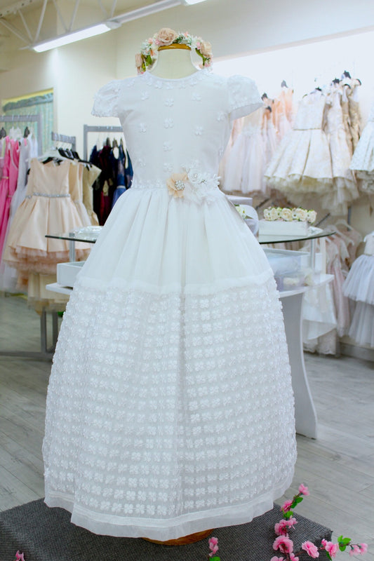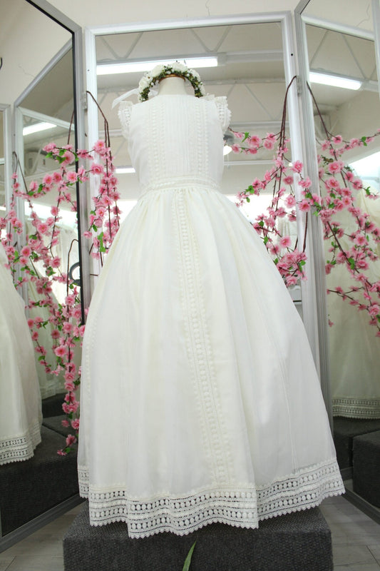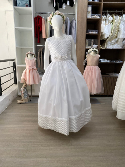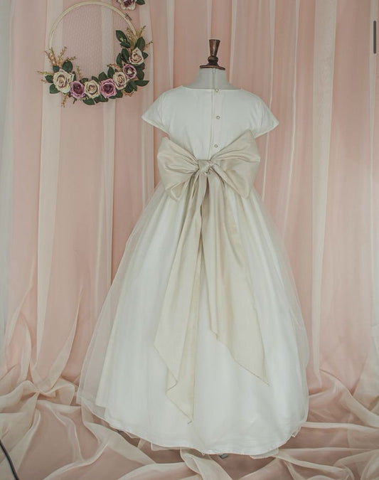 Vestido primera comunión, manga corta, detalles en talle y cintura