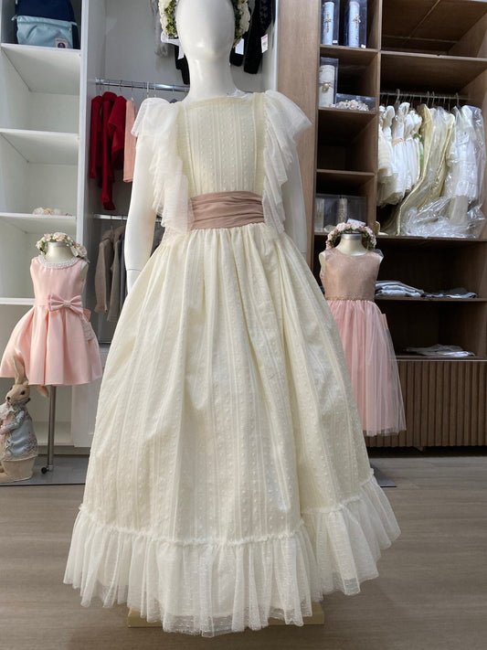 Vestido primera comunión, capa desmontable,cinto rosa y falda de tul