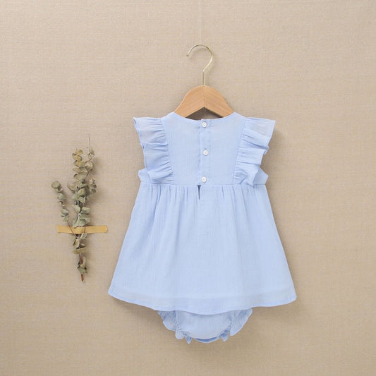 vestido de bebé niña con cubrepañal en bambula en azul celeste