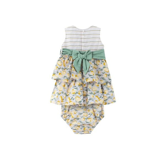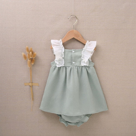 vestido de bebé niña con cubrepañal en bambula verde olivo con volantes en contraste