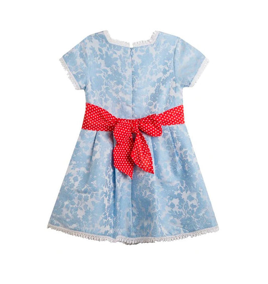 vestido azul con moño rojo en la parte de atrás