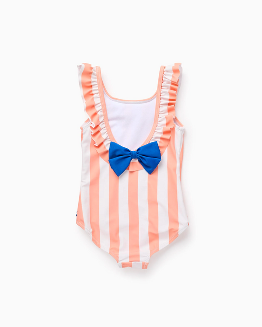 Traje de Baño a Rayas con Conchas 3D para Bebé Niña, Naranja/Blanco
