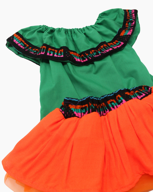 Set Patrio Falda Tipo TuTu Cambaya Naranja y Blusa Campesina verde con pompones rosa