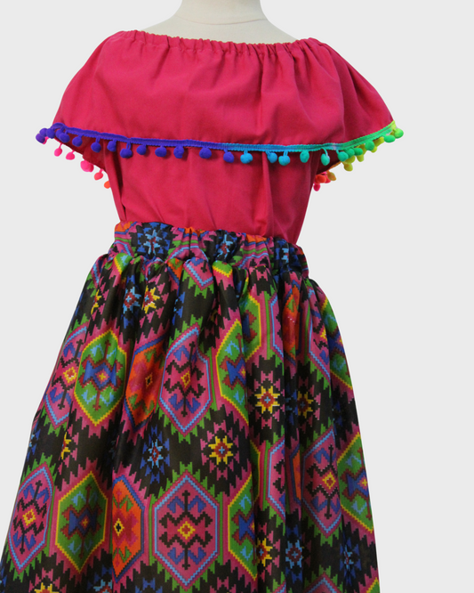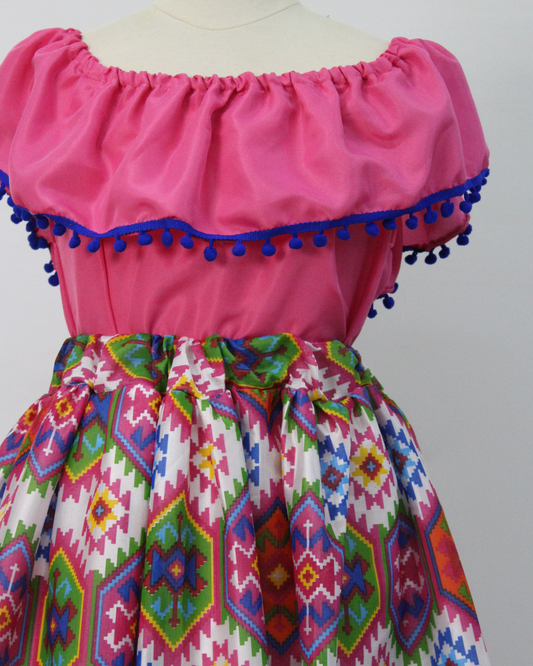 Set Patrio Falda con Elementos Estilo Mexicana y Blusa Campesina color Rosa Pompon Colores