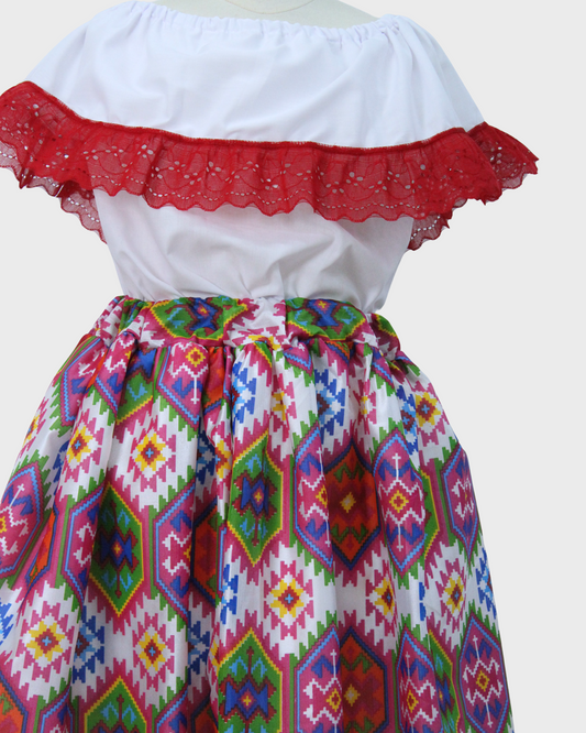 Set Patrio Falda con Elementos Estilo Mexicana y Blusa Campesina color Blanco