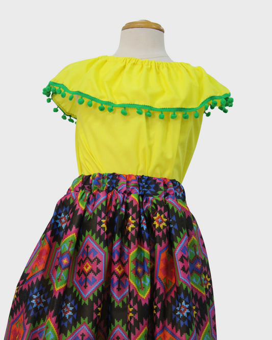 Set Patrio Falda con Elementos Estilo Mexicana y Blusa Campesina color Amarillo, Pompon Verde