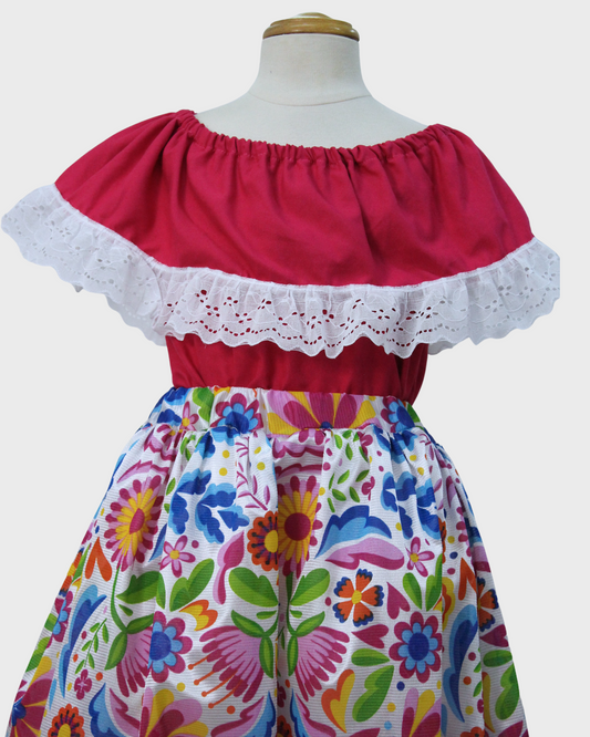 Set Patrio Falda con Elementos Estilo Mexicana y Blusa Campesina color Rosa Encaje Blanco