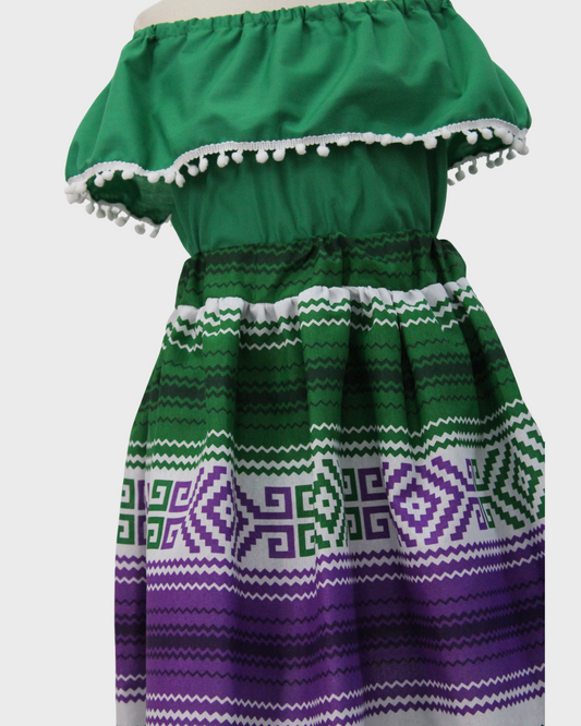 Set Patrio Falda Rayas Estilo Mexicana y Blusa Campesina color Verde pompones Blancos