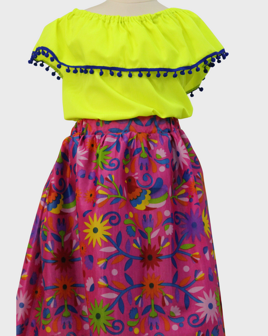 Set Patrio Falda Estampado Estilo Mexicana y Blusa Campesina color Amarillo fluorescente