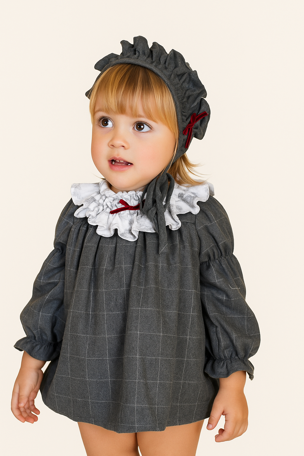Elegante vestido a cuadros en tonos plomo que combina sofisticación con comodidad. El distintivo cuello blanco añade un toque clásico y versátil, perfecto para crear looks tanto casuales como más formales. Una prenda versátil que se adapta a diferentes ocasiones y estilos personales.