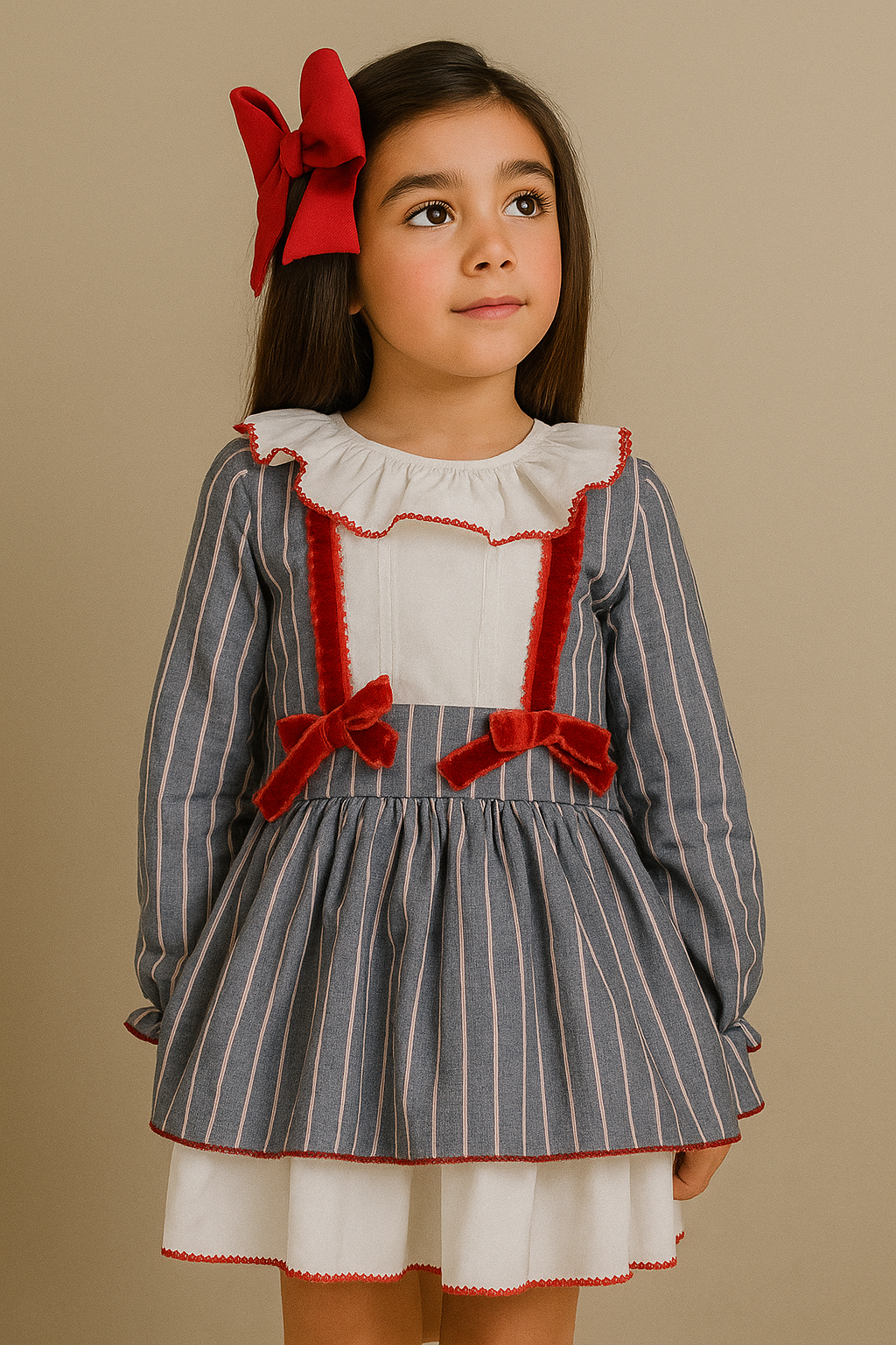 Vestido de rayas azul y blanco con un toque especial de olán en el cuello que le da un aire elegante y femenino. Este diseño clásico combina comodidad y estilo, perfecto para que tu pequeña se sienta segura y hermosa en cualquier ocasión. Las rayas atemporales crean un look versátil que funciona tanto para días escolares como para celebraciones especiales. El olán delicado en el cuello añade un detalle romántico que realza la belleza natural de la prenda. Confeccionado pensando en la calidad y el confort de las niñas, este vestido es una opción confiable que acompañará a tu hija con estilo.
