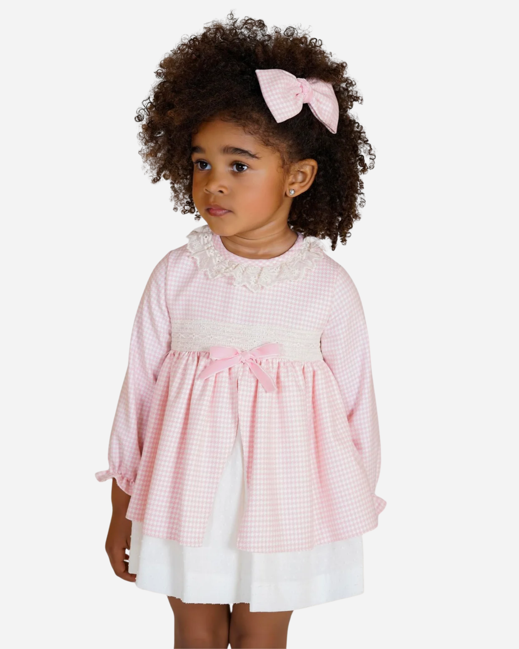 Elegante vestido infantil con patrón de pata de gallo que combina texturas sofisticadas. Presenta un delicado cuello de encaje que añade un toque de feminidad, detalles de punto roto estratégicamente colocados y una falda interior cómoda. Perfecto para ocasiones especiales o días en los que deseas que tu pequeña se sienta hermosa y segura de sí misma.