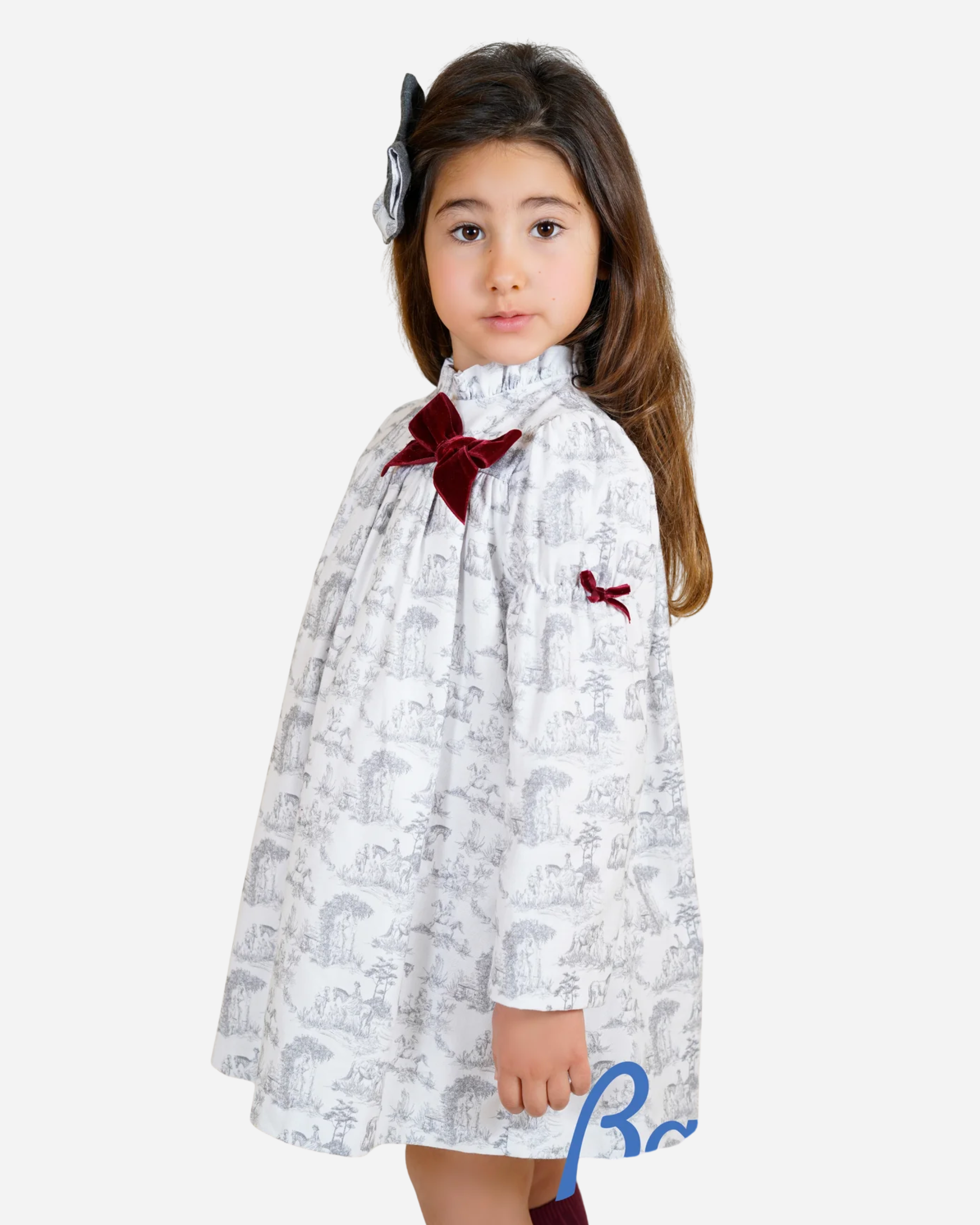 Elegante vestido infantil en blanco con un delicado patrón de caballitos que le da un toque lúdico y encantador. Complementado con un hermoso moño de terciopelo en tono vino que añade sofisticación y calidez al conjunto. Perfecto para ocasiones especiales donde tu pequeña brille con estilo y comodidad.