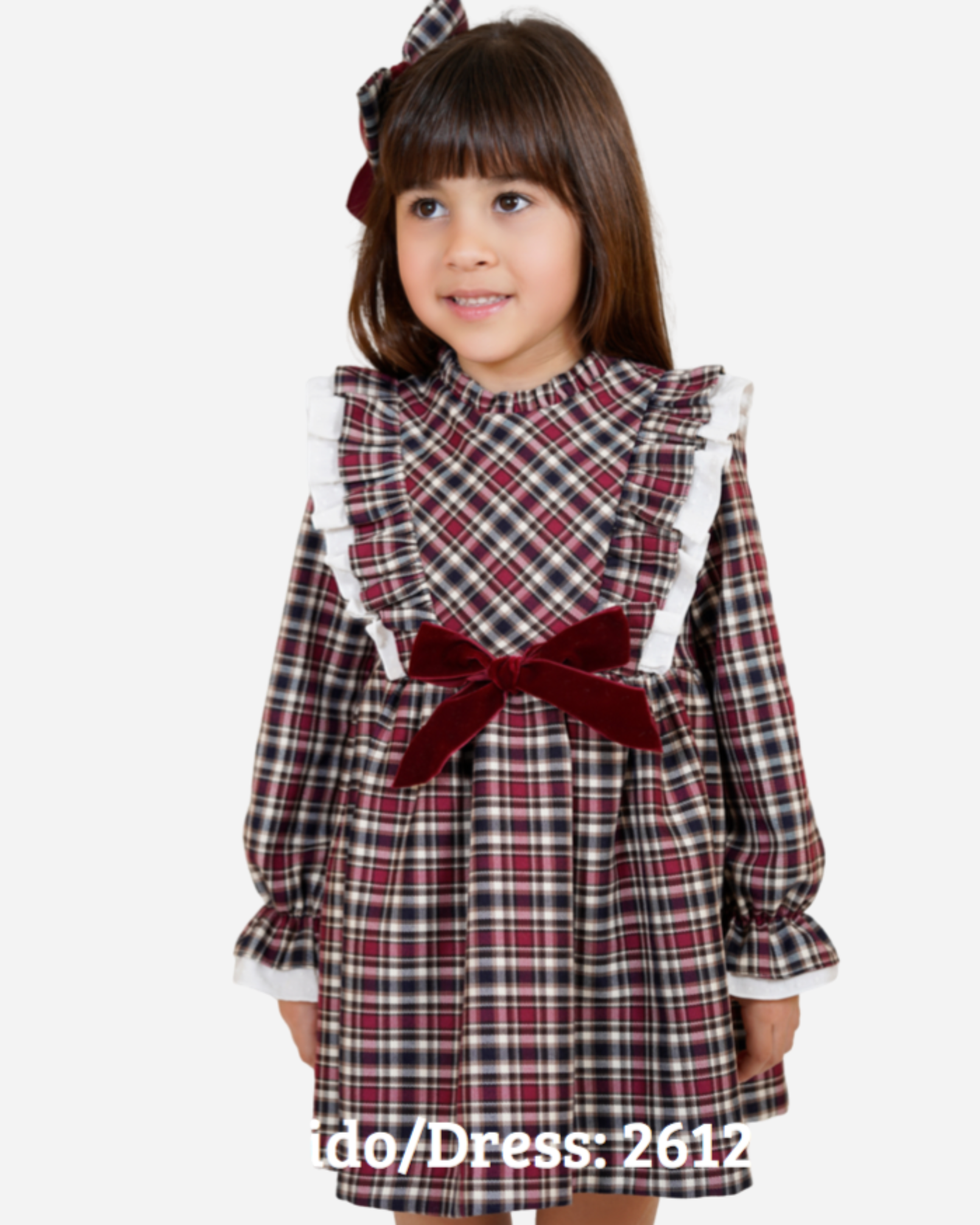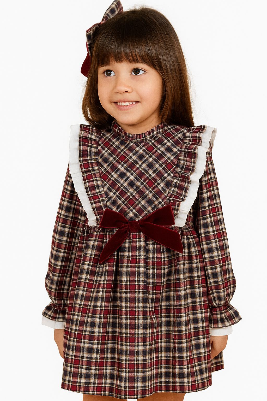 Elegante vestido infantil con diseño a cuadros en tonos vino que combina la sofisticación de la moda española.