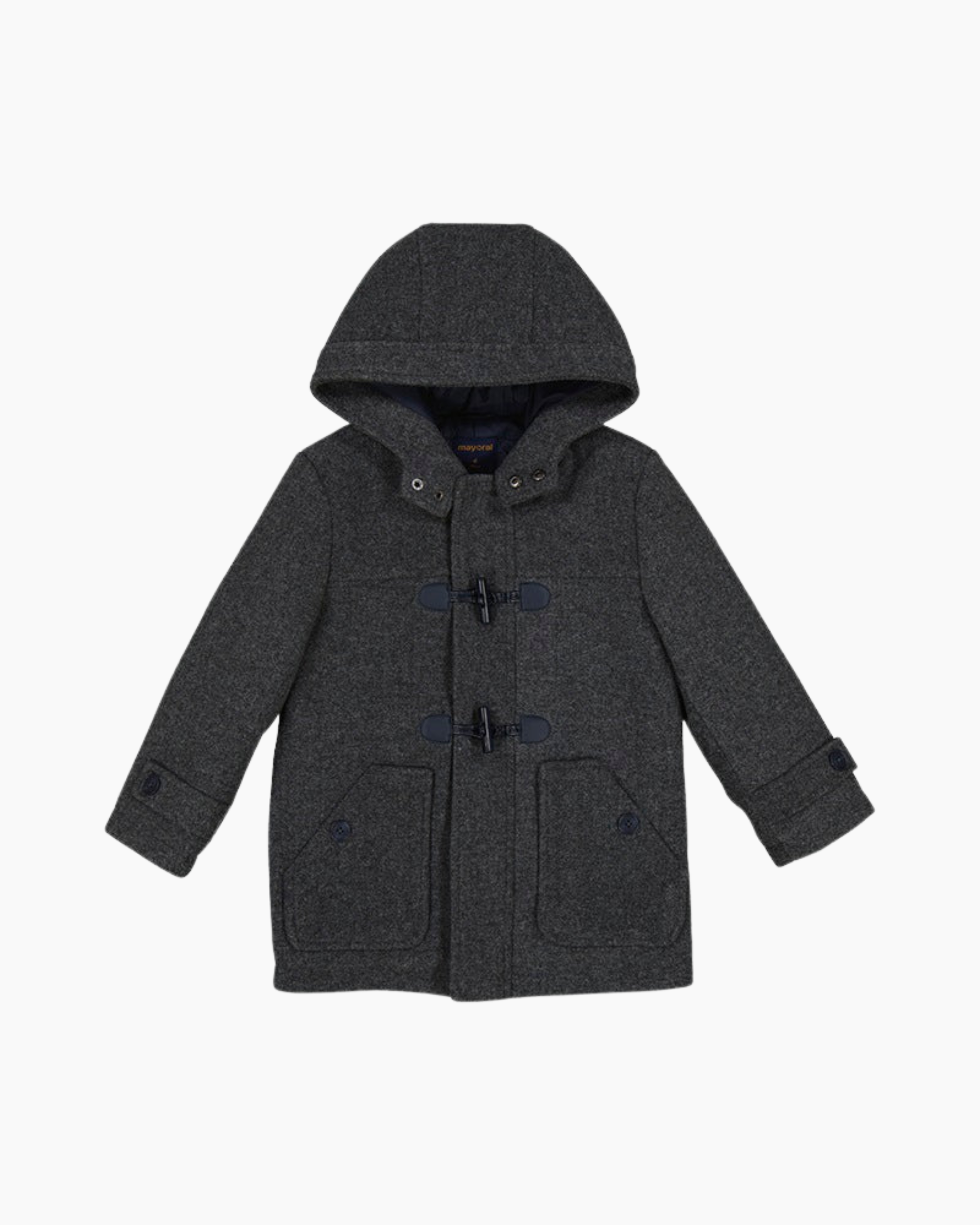 Abrigo infantil con capucha en tono asfalto, diseñado con 2 botones funcionales y confeccionado en tela vigore de calidad . Una prenda versátil y cómoda que protege a tu hijo del clima mientras mantiene un estilo clásico y elegante. Perfecto para el día a día.