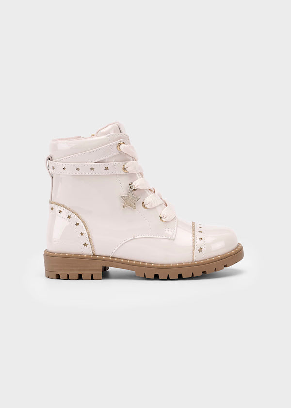 Botín biker charol crudo con detalles de estrellas que combina estilo y comodidad para las niñas modernas. Este calzado versátil presenta un acabado en charol brillante