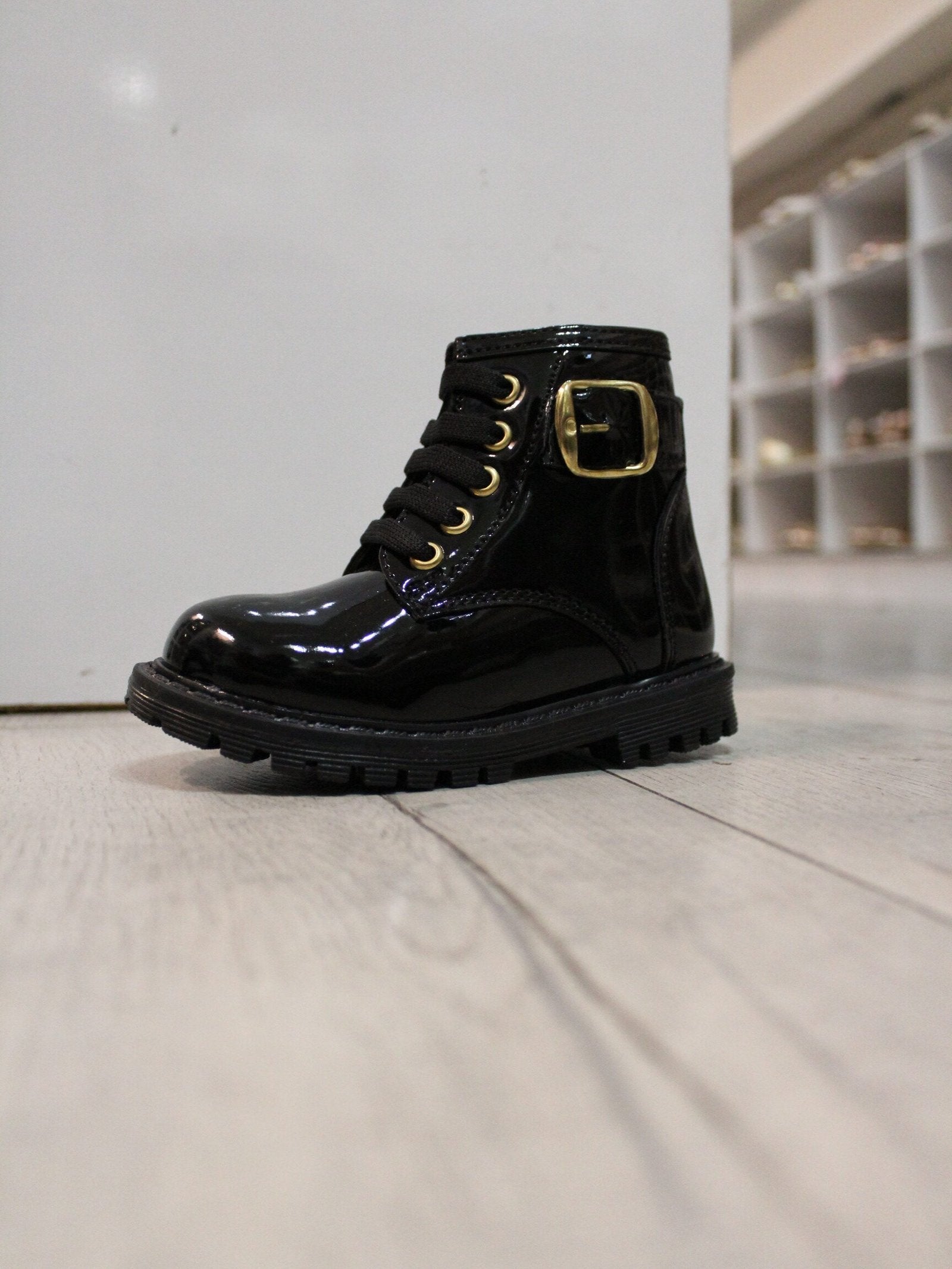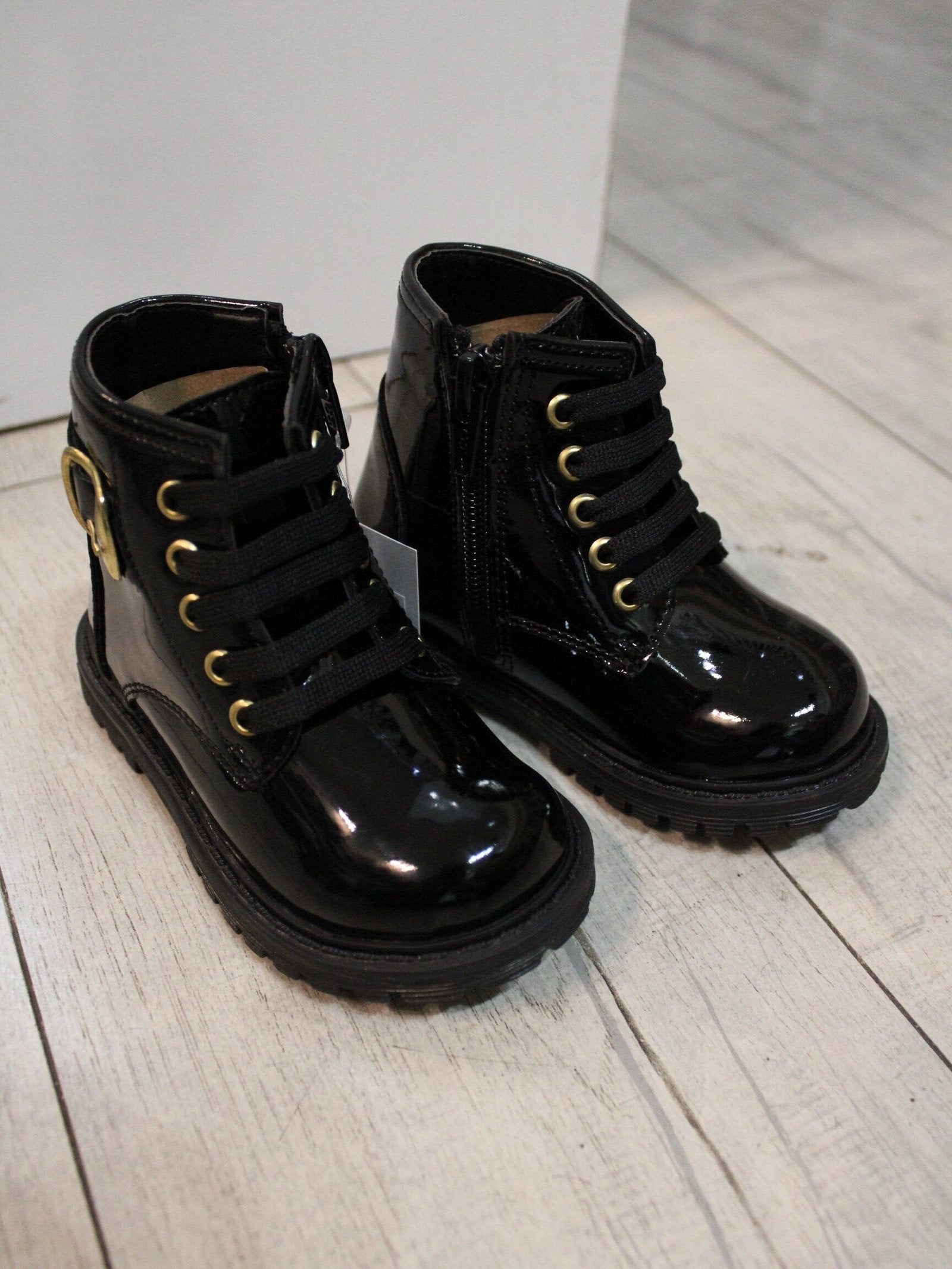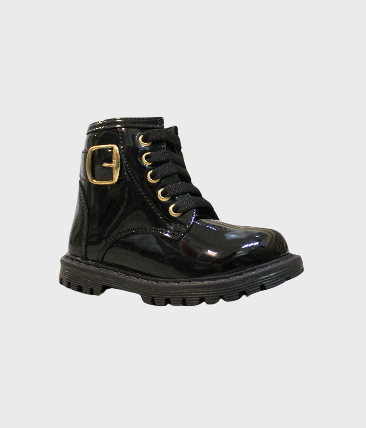 botín color negro de charol, con hebilla color oro