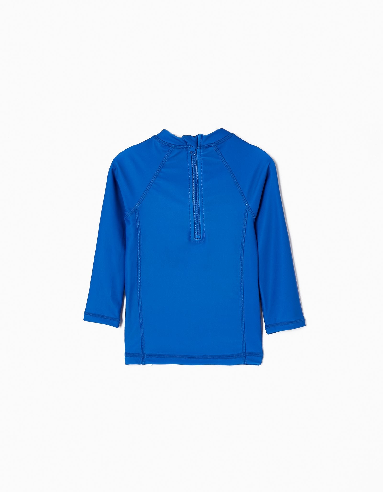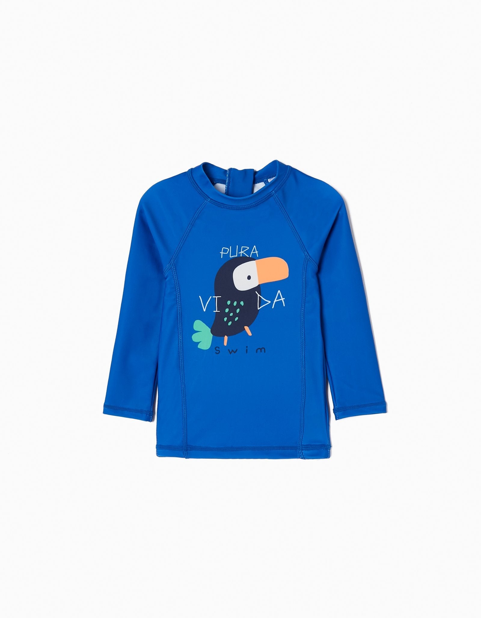 camiseta uv color azul, print tucan pura vida,  ciere por la parte trasera, tela resistente al sol, filtro uv 80