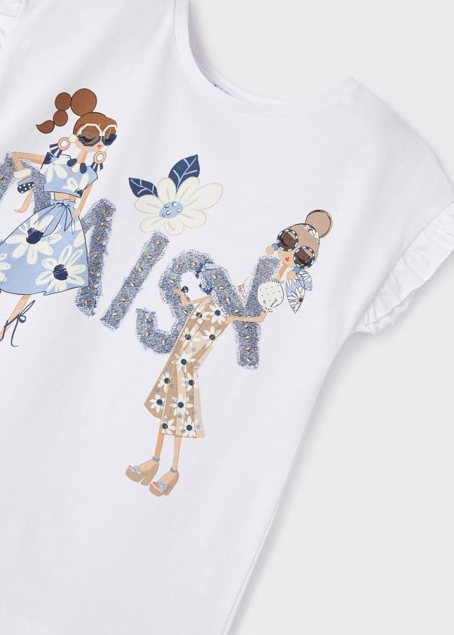 Playera de manga corta para niña. Cuello redondo. Tejido 100% algodón. Diseño estampado.