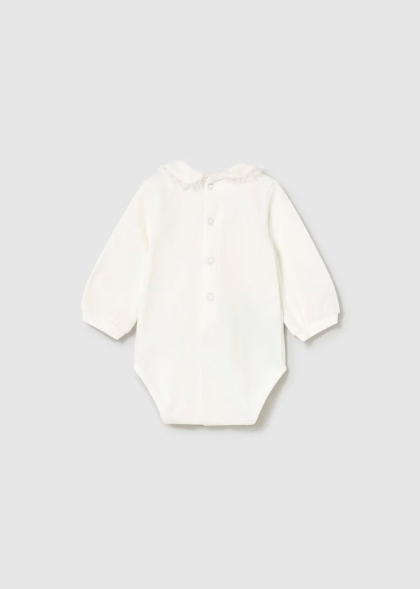 Body de manga larga para recién nacida con puños elásticos. Cuello bebé. Cierre con botones a presión en la parte posterior. Botones a presión en la entrepierna para facilitar la puesta de la prenda. Elementos de adorno: volante decorativo.