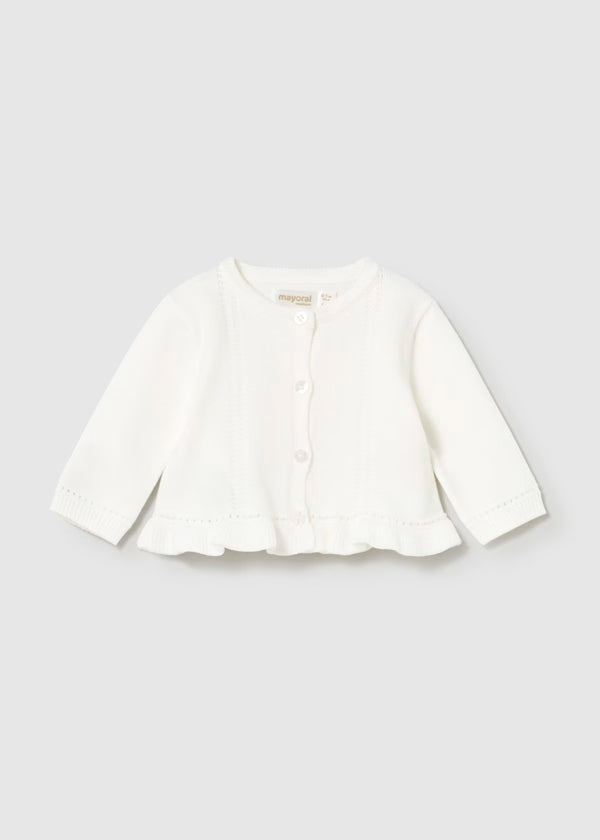 Rebeca de manga larga para recién nacida. Cuello redondo. Cierre con botones en la parte delantera. Diseño con volante en el bajo de la prenda.