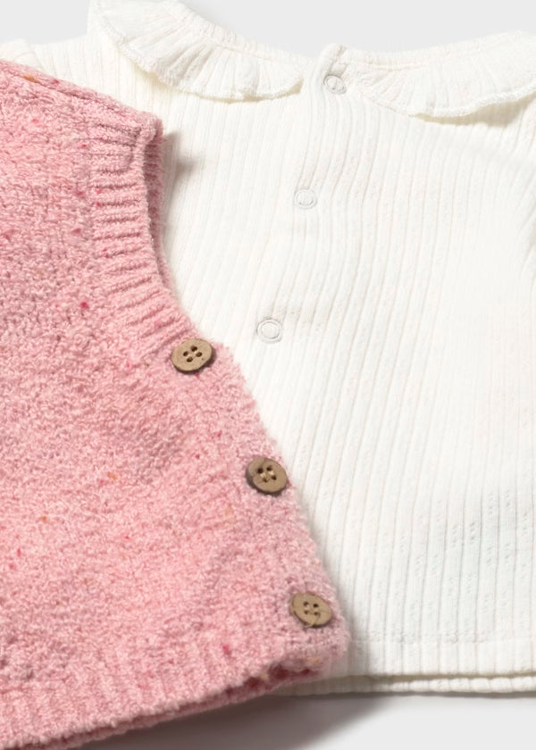 Chaleco sin mangas para recién nacido. Cuello redondo. Cierre con botones en la parte delantera. Botón en el hombro para facilitar la puesta de la prenda.