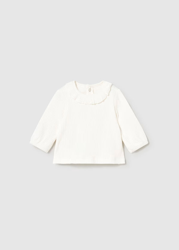 Camiseta de manga larga para recién nacido. Cuello redondo con volante. Cierre con botones a presión en la parte posterior.