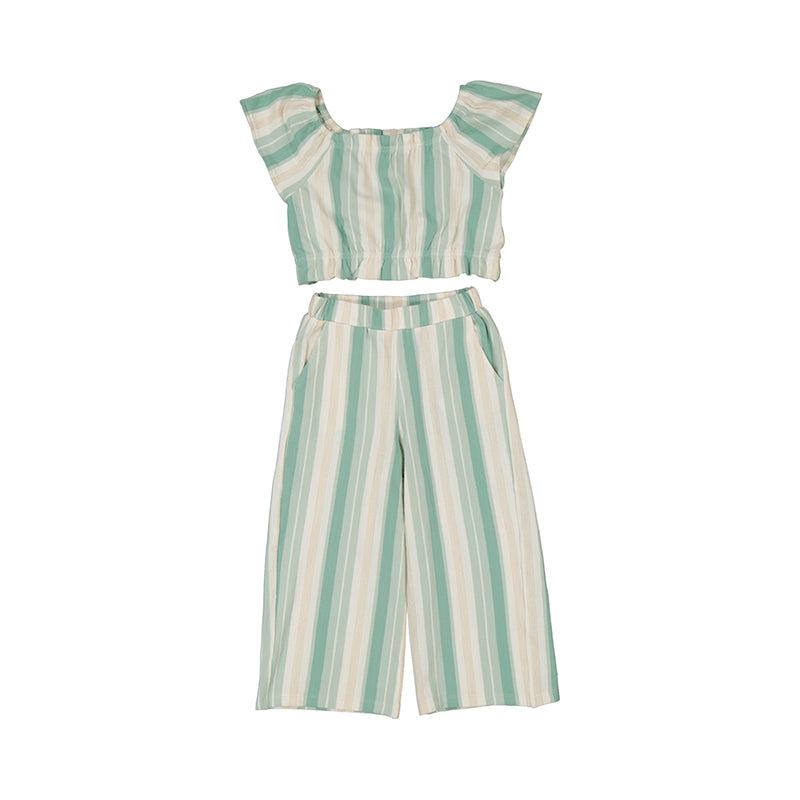 ¡Viste a tu niña radiante en este conjunto de pantalón largo y playera de rayas! Perfecto para un día soleado o para una ocasión casual. ¡Cómodo y a la moda!