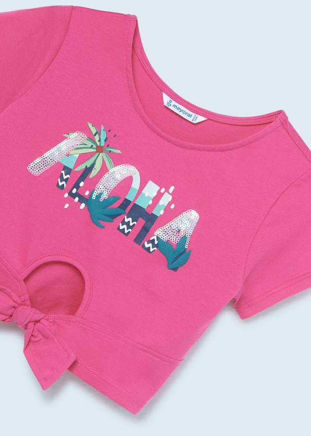 Playera de manga corta para chica. Cuello redondo. Elementos de adorno: moño decorativo. Diseño estampado.