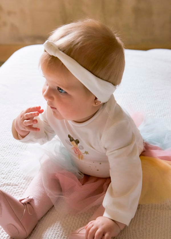Leotardo de trama tupida para recién nacida con cintura elástica para un mejor ajuste. Diseño con falda en superposición sobre el leotardo.