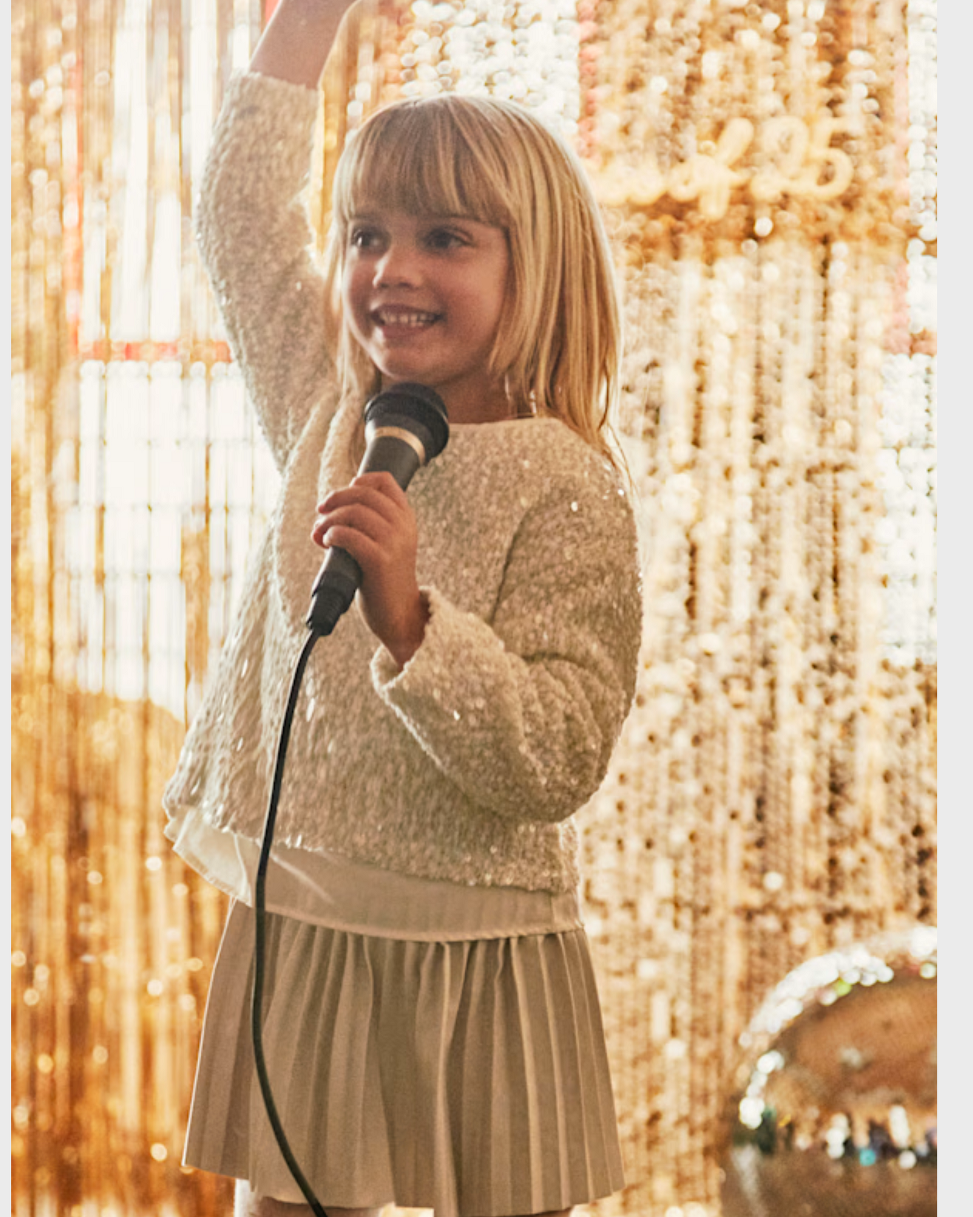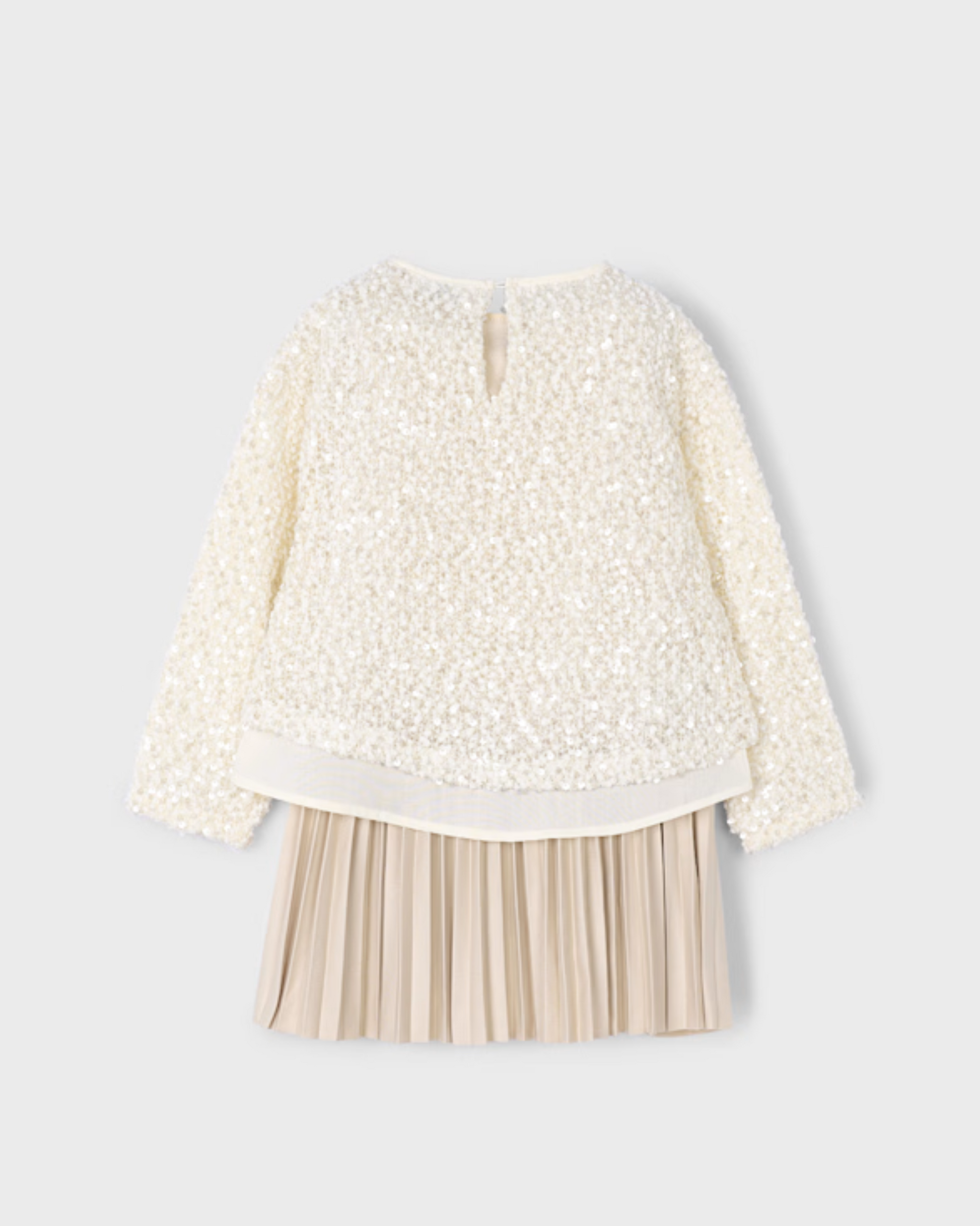 Blusa de manga larga para niña. Cuello redondo. Diseño simulado con prendas en superposición. Abertura con botón en el cuello para facilitar la puesta de la prenda. Elementos de adorno: lentejuelas.