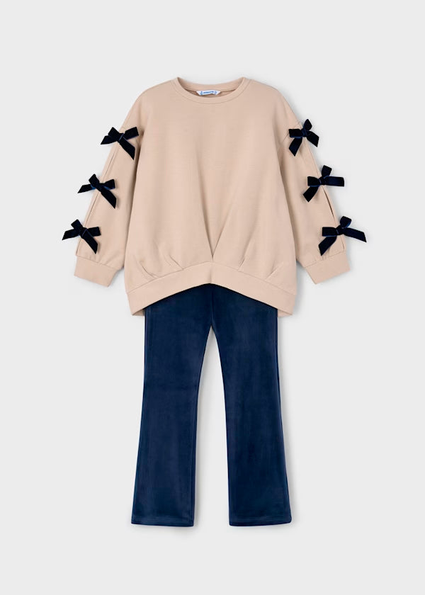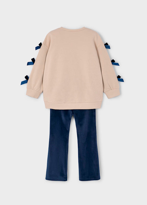 Sudadera de manga larga para niña. Cuello redondo. Elementos de adorno: detalles fruncidos, apliques de lazos.