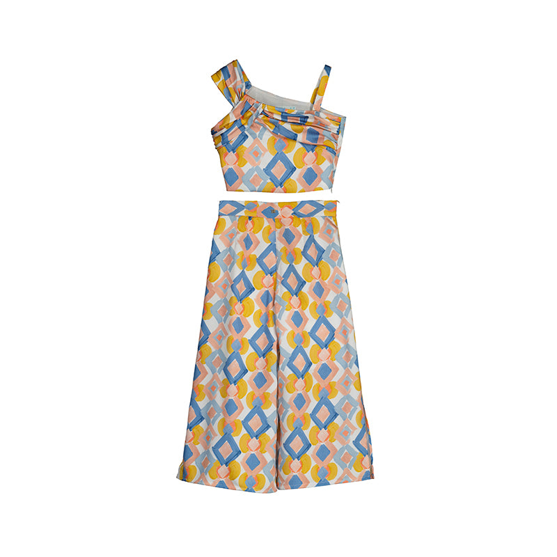 conjunto pantalón rombo azules y blusa de tirantes