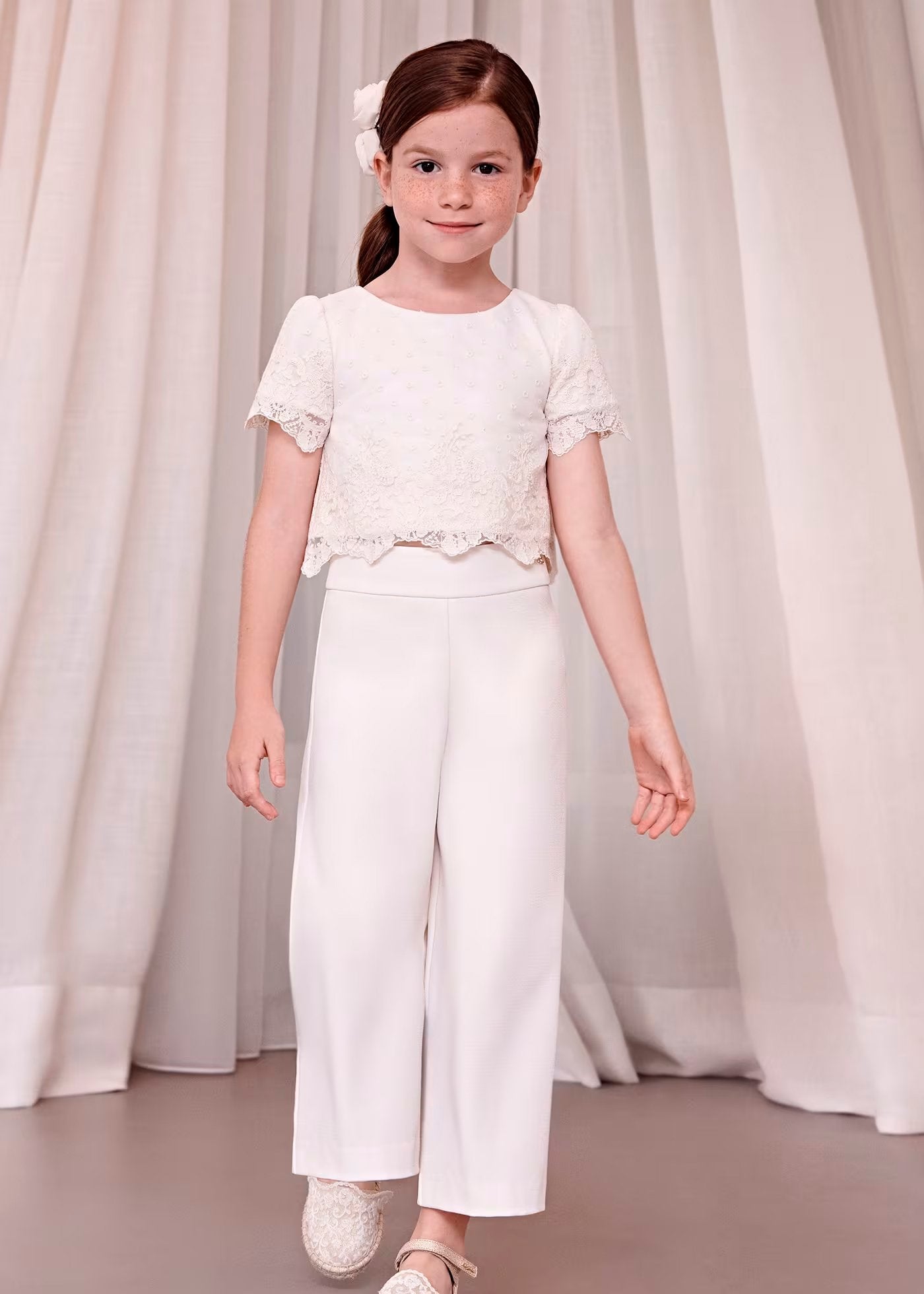 Conjunto de pantalón largo confeccionado en crepé color crudo, diseñado para brindar comodidad y estilo a tu pequeña en cualquier ocasión. Una opción versátil y elegante para su guardarropa.