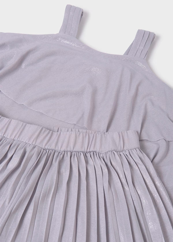 Este conjunto de pantalón y top plisado es perfecto para cualquier ocasión, ya sea formal o casual, para niñas. Hecho con materiales de calidad y un diseño elegante, brinda comodidad y estilo al mismo tiempo. ¡Ideal para las pequeñas fashionistas de la casa!