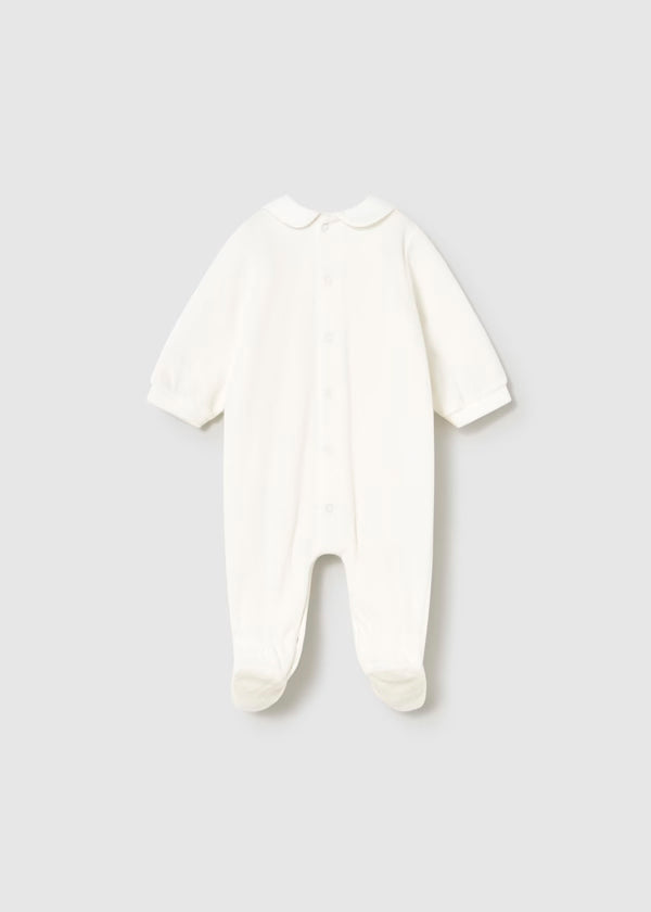 Pijama de manga larga para recién nacido. Cuello bebé. Cierre con botones a presión en la parte posterior. Botones a presión en la entrepierna para facilitar la puesta de la prenda. Elementos de adorno: aplique floral, bordado
