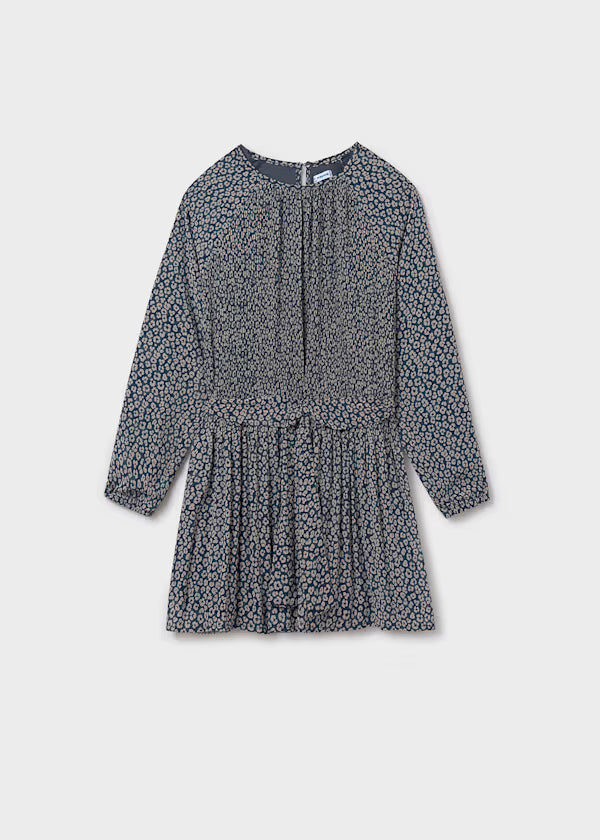 Vestido de manga larga para chica con puños elásticos. Cuello redondo. Pequeña abertura en la espalda con cierre de botón para facilitar la puesta de la prenda. Modelo con diseño plisado. Diseño estampado.