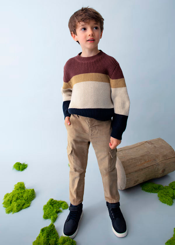 Jersey de manga larga para niño. Cuello redondo. Confección combinada en distintos tejidos para conseguir un diseño único y especial. Elementos de adorno: detalles de canalé.