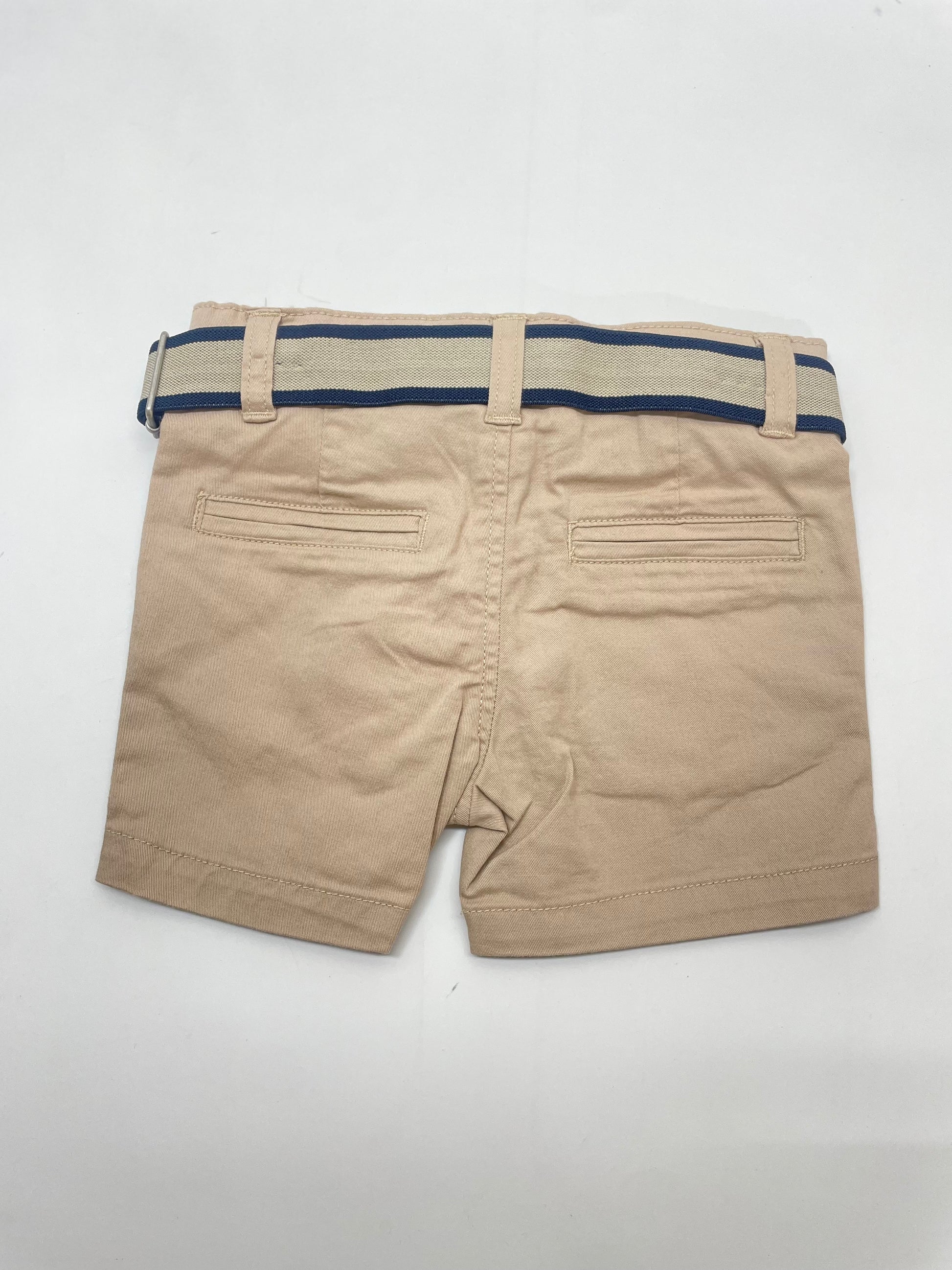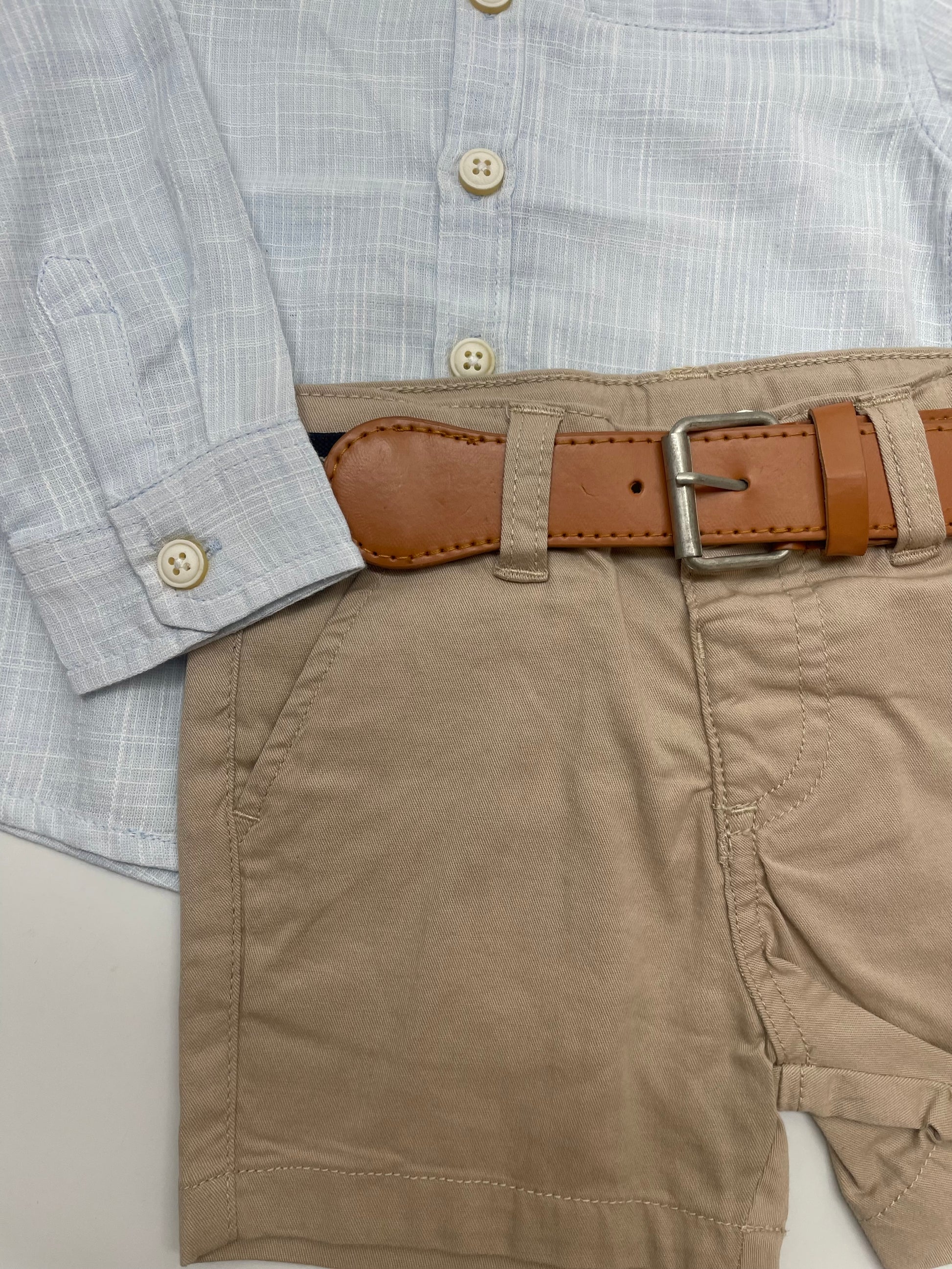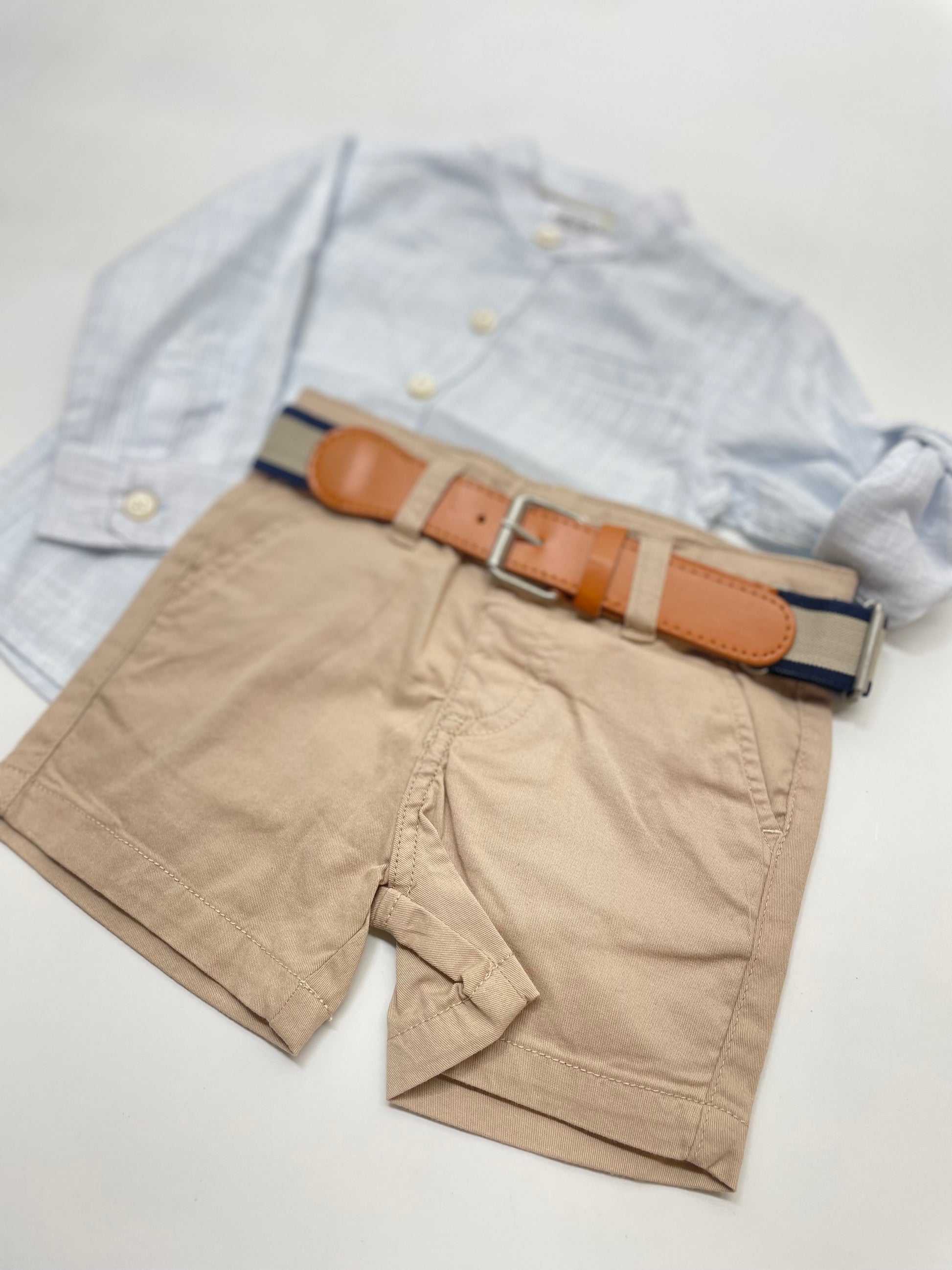 camisa manga larga cuello mao tela super ligera y short beige con ajuste interior y bolsas delanteras.