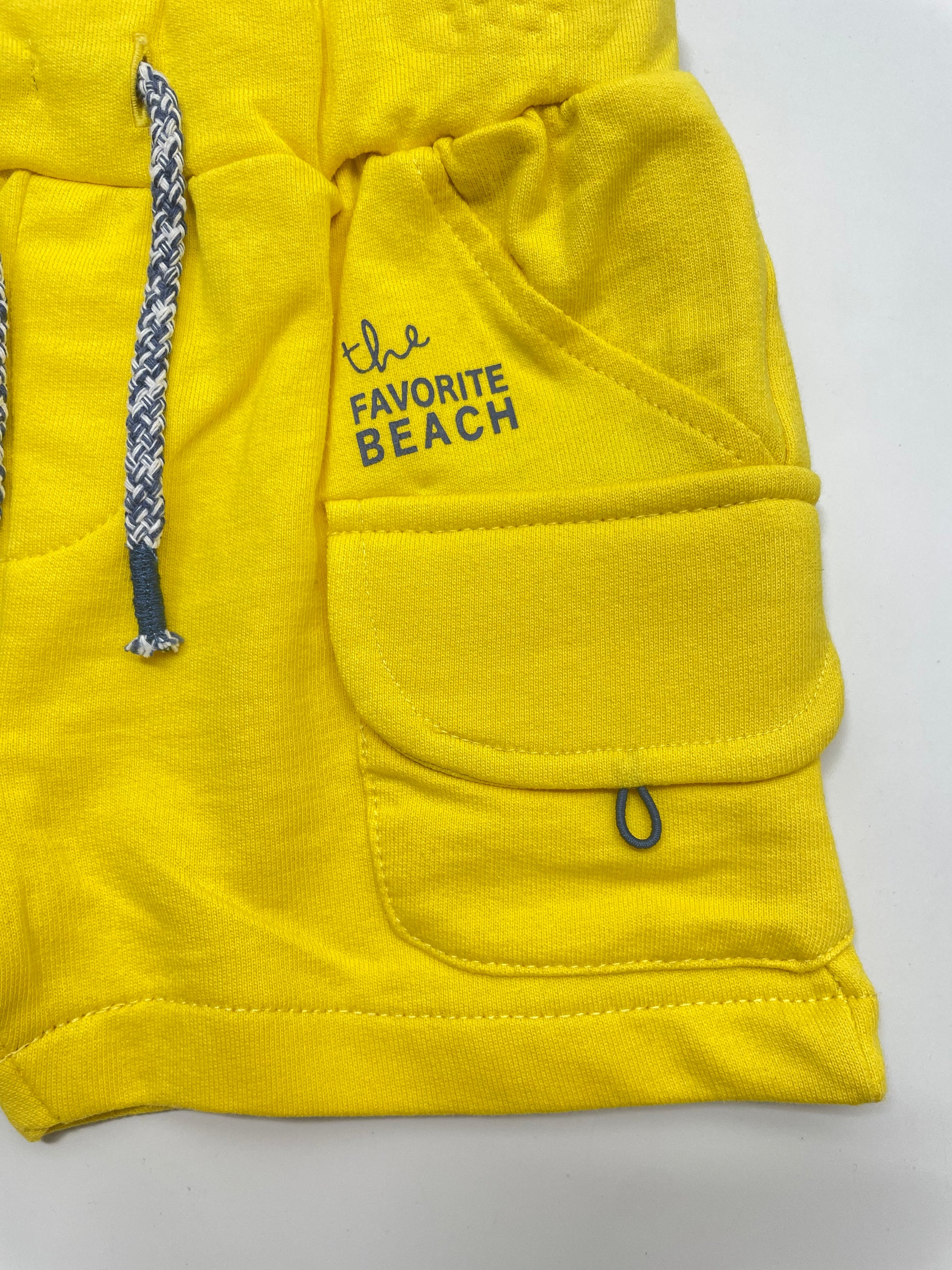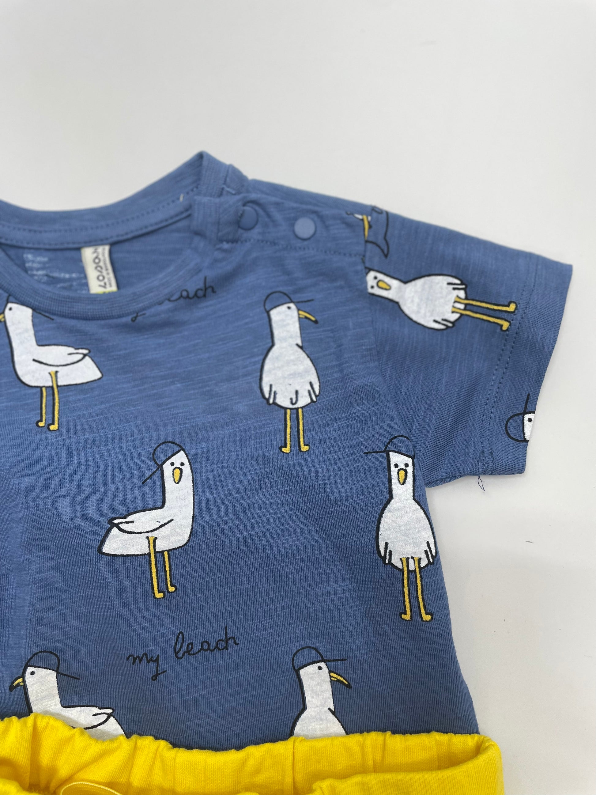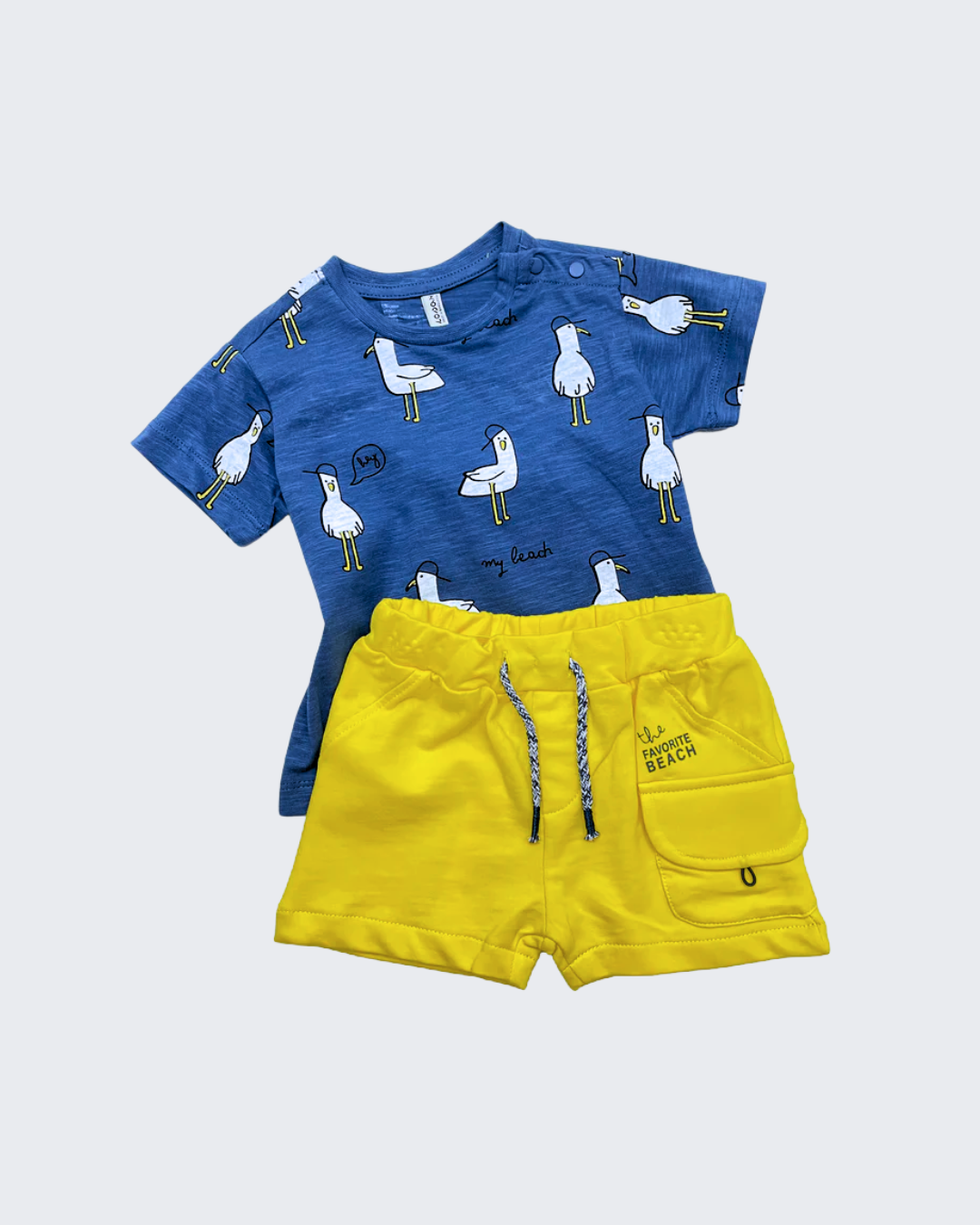 Conjunto de algodón premium para bebé niño, diseñado con una camiseta estampada de gaviotas y un short amarillo con jareta ajustable. La tela de algodón garantiza suavidad contra la piel sensible, transpirabilidad durante el día y durabilidad tras múltiples lavados.